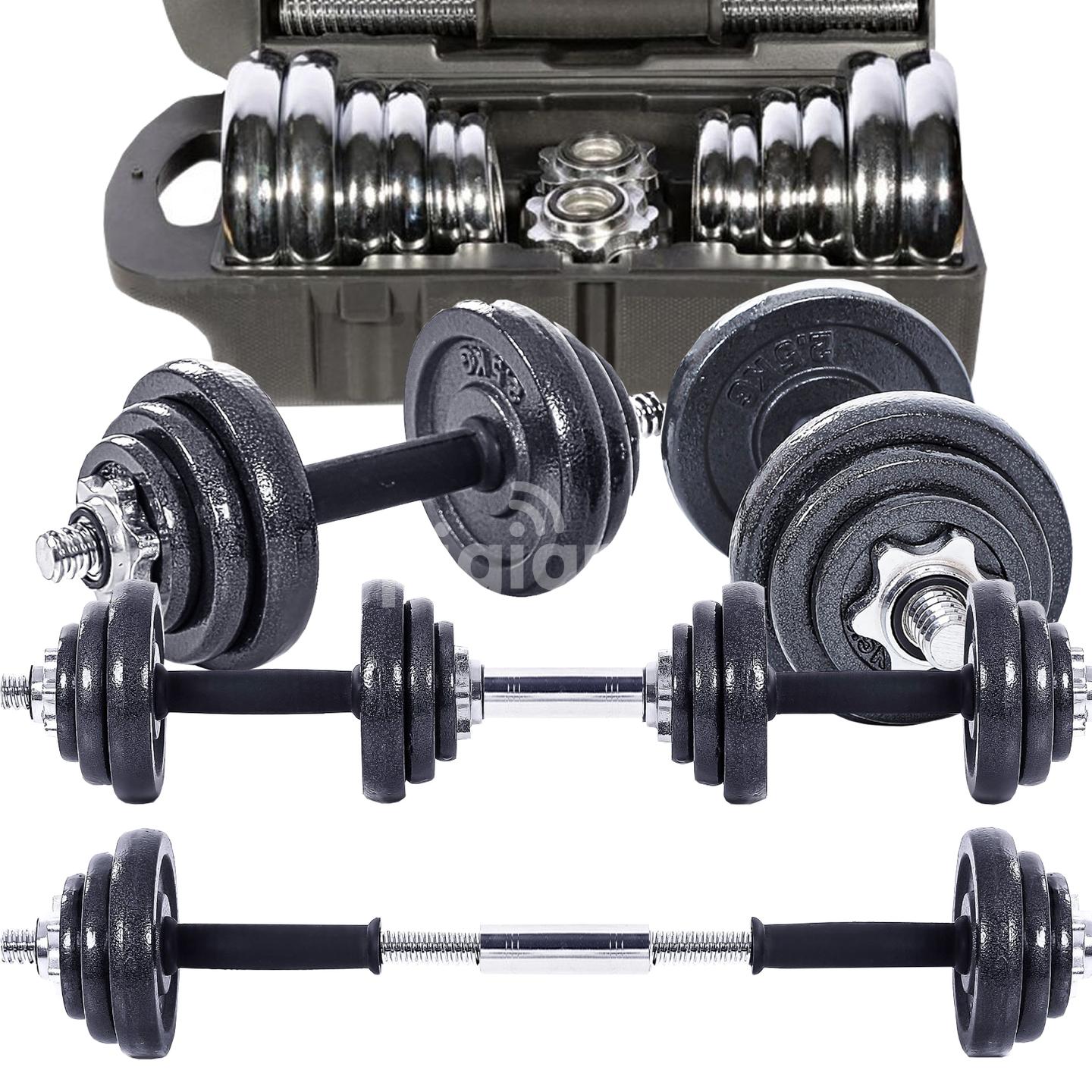 30kg Cast Iron Adjustable Dumbbell Weight Set – Can be used as 2 x 15kg dumbbells or joined to create a single barbell – Steel connecting tube easily converts equipment from dumbbells into a barbell in secondsSelection of cast iron weight plates totalling 25kg allow you to change up your weight load as desired – Versatile weight set is suitable for users of all abilitiesNon-slip knurled handles provide a secure and comfortable grip – Spinlock collars ensure plates stay securely in position throughout training and allow quick weight changesSet includes: 8 x 2.5kg weight plates, 4 x 1.25kg weight plates, 2 x dumbbell bars, 1 x connecting tube and 4 x spinlock collars – Measurements: Dumbbell length: 44.5cm – Barbell length: 99.5cm – Sleeve length: 15.5cmTotal weight including bars and collars = 30kg.