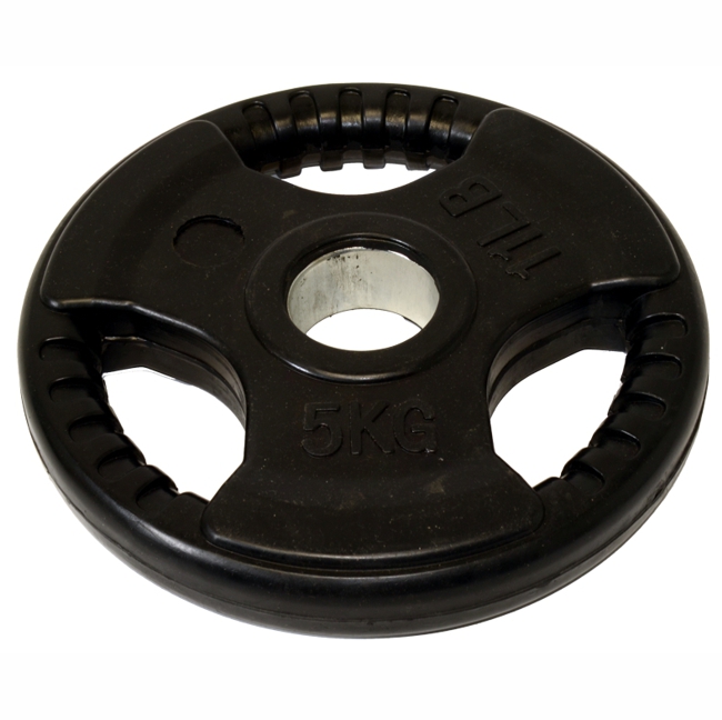 - The recessed tri-grip handles have spacious openings fitting comfortably in the hand, are rounded with integrated finger slots and slotted for easy loading and offloading. The weight numbers are molded into each plate. The solid steel precision hub ensures a perfect fit on standard bars.